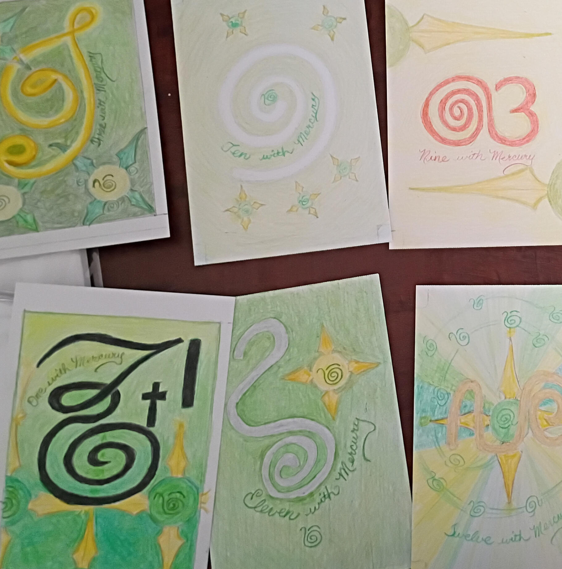 You have likely heard of the elements, fire, water, air, and earth. But, humans can experience seven elements, in our twelve dimensions. Did you know, Oil, Aether, and Mercury are also elements? Here are a few of the original drawings I created, combining the properties of Mercury, with the light codes for Numbers. These examples are all found in the Oraphim Lightbringer Cards for Integration & Remembrance.The 144 activation cards and 70 page book are available as a set, directly from the artist, only. 100 sets are available, from this first printing. A PDF of all images will also be included. The options are: $77 payable with cards, through a Stripe link (button near page footer), or direct wallet transfer of 77 XRP. There is also a digital only option for $17, the book and images in PDF form. email [email protected] if you have questions.